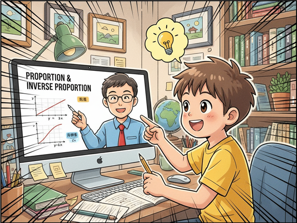 本日の小5(インターナショナルスクール)のオンライン指導は数検5級(中1レベル)の比例・反比例について学習しました!1組の x, y 値から比例定数 a を求め、比例や反比例を表す式を求める練習を行いました。
