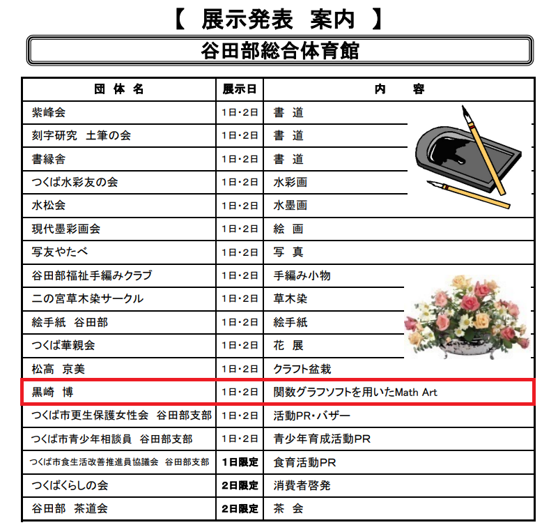 令和7年度つくば市民文化祭谷田部会場【展示発表】案内が公開されました。私は谷田部総合体育館にて、「関数グラフソフトを用いたMath Art(数学アート)」をテーマに作品を展示します。数式で描く、美しい幾何学模様のアートを […]