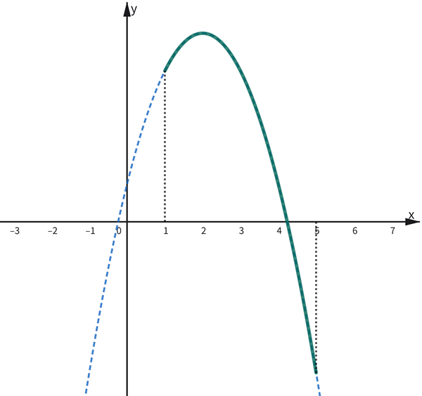 \(y=-x^2+4x+a\) (\(a\):定数) の \(1≦x≦5\) における \(y\) の最小値が \(1\) のとき、\(a\) の値を求めなさい。