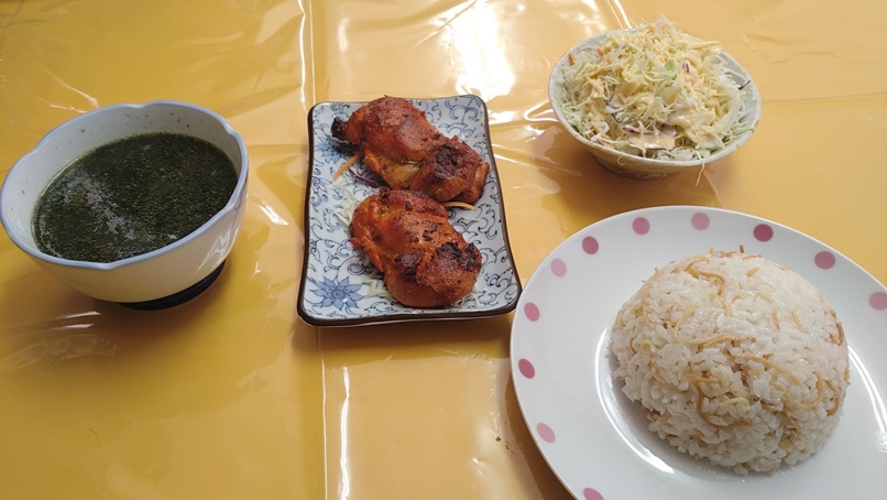 メインのモロヘイヤスープは、日本ではあまり馴染みのないとろみが特徴。エジプトのライスは、細かく砕いたパスタ(米粒状のショートパスタ)が混ぜ込まれており、このライスにモロヘイヤのとろみを絡ませていただくのが現地流だそうです。セットのチキンはスパイシーな味付けで、食欲をそそる美味しさでした。