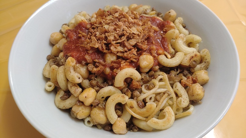エジプトの国民食とも呼ばれる屋台料理「コシャリ」も注文。ご飯、レンズ豆、数種類のパスタがミックスされており、その上から酸味のあるトマトソースと香ばしいフライドオニオンがたっぷりトッピングされています。食べる直前に全体をよくかき混ぜるのがポイント!様々な食感と風味が一体となり、深い味わいを楽しめます。