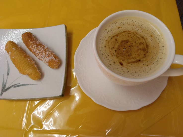 食後には、カフェラテとエジプトの伝統的なお菓子「アサビー・ザイナブ」をいただきました。甘いアサビー・ザイナブで、異国情緒あふれる食事が締めくくられました。